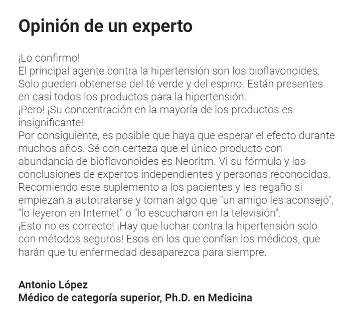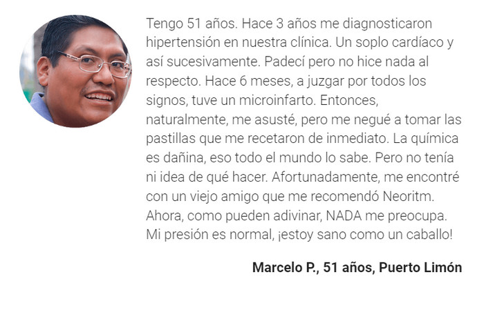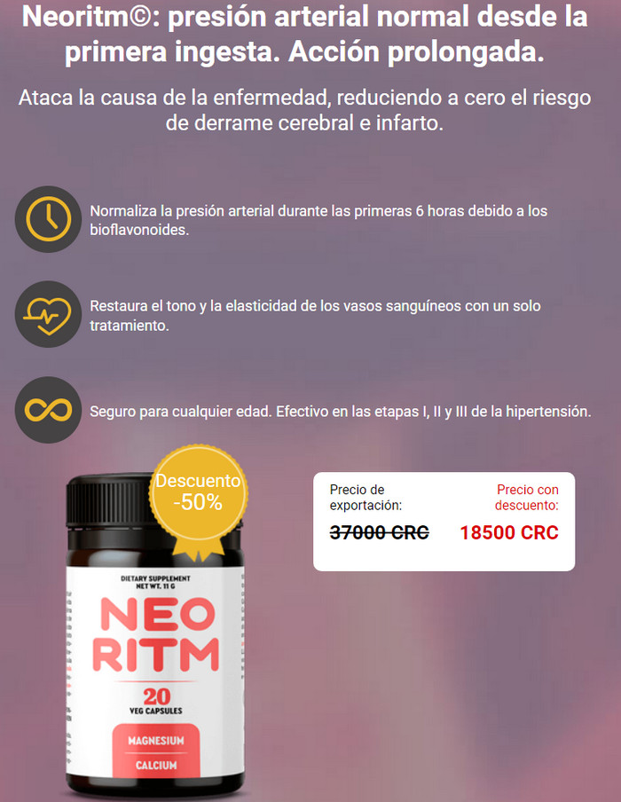 Ayudarse a sí mismo en esta condición peligrosa ayudará a remediar Neoritm gracias a él, la hipertensión retrocede. En este artículo, podrá encontrar información sobre que es Neoritm, para que sirve, cómo funciona el producto, cuáles son sus ventajas, cómo usarlo de acuerdo con las instrucciones de uso y dosis, donde comprar Neoritm, donde lo venden en Costa Rica y qué es su precio. También en los foros y pagina oficial puedes leer testimonios, comentarios y opiniones sobre Neoritm.