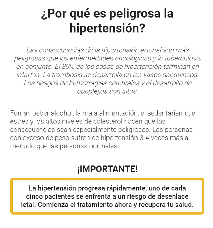 La fórmula del remedio está diseñada para incluir todos los componentes necesarios que pueden normalizar la presión arterial y los niveles de colesterol en la sangre. Asimismo, los componentes vegetales naturales de este complejo son capaces de fortalecer el sistema inmunológico y protegerlo de los estímulos externos.