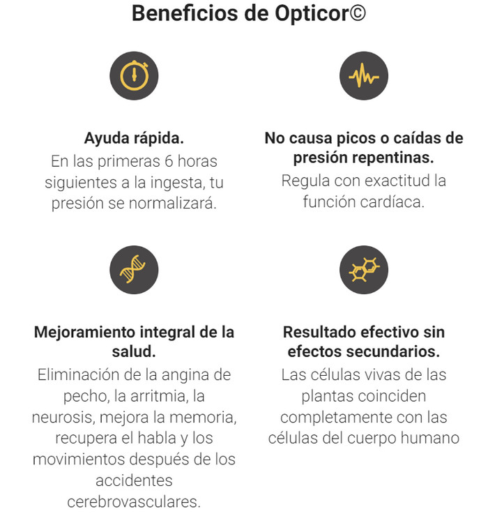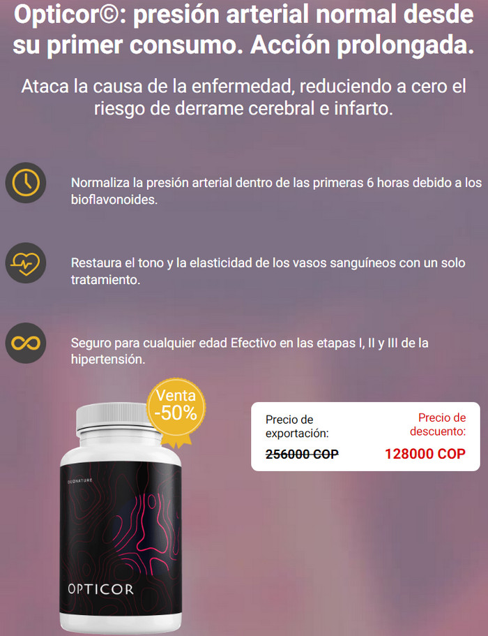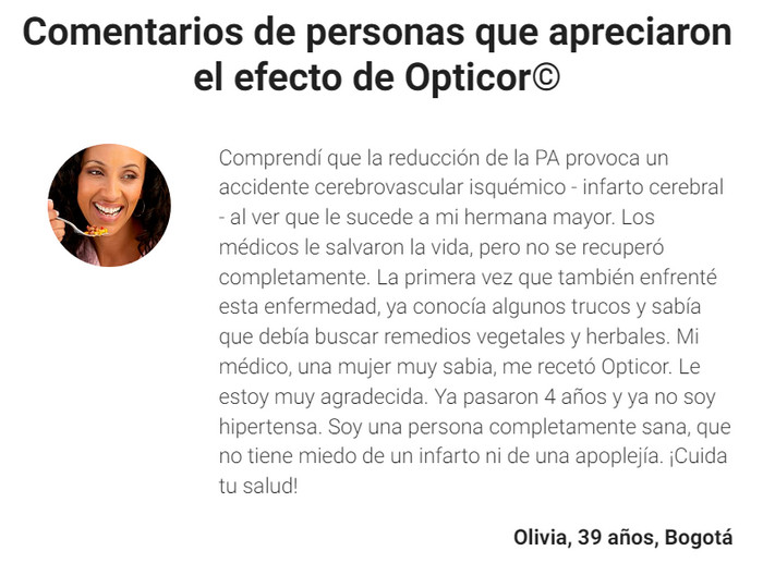 Veamos que es Opticor, para qué sirve, cómo funciona el producto para la hipertensión, cuáles son sus ventajas sobre las contrapartes de farmacia que no funcionan, cómo usar las cápsulas de acuerdo con las instrucciones de uso y dosis, donde la venden Opticor en Colombia y también cual es su precio de Opticor. En los foros puedes leer testimonios, comentarios y opiniones reales de usuarios satisfechos.