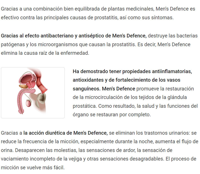 La inflamación de la glándula prostática se caracteriza por síntomas graves, lo que ayuda a hacer frente a un nuevo remedio para la prostatitis Men’s Defence. Dolor al orinar, empeoramiento de la erección, malestar en la ingle, necesidad frecuente de ir al baño: esta es una parte insignificante de los signos de que esta enfermedad se manifiesta. Según el fabricante, su medicamento ayudará en un corto período de tiempo a eliminar las manifestaciones clínicas de la enfermedad y mejorar la condición del paciente. Y para determinar si es posible confiar en los requisitos establecidos por el fabricante, es necesario considerar en detalle el medicamento y su mecanismo de acción.
