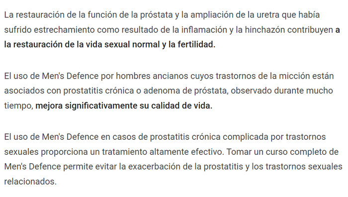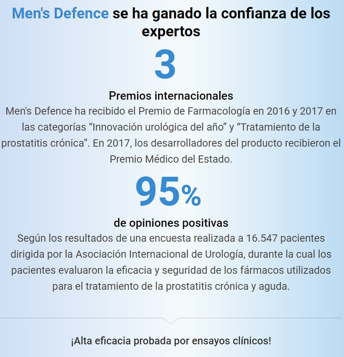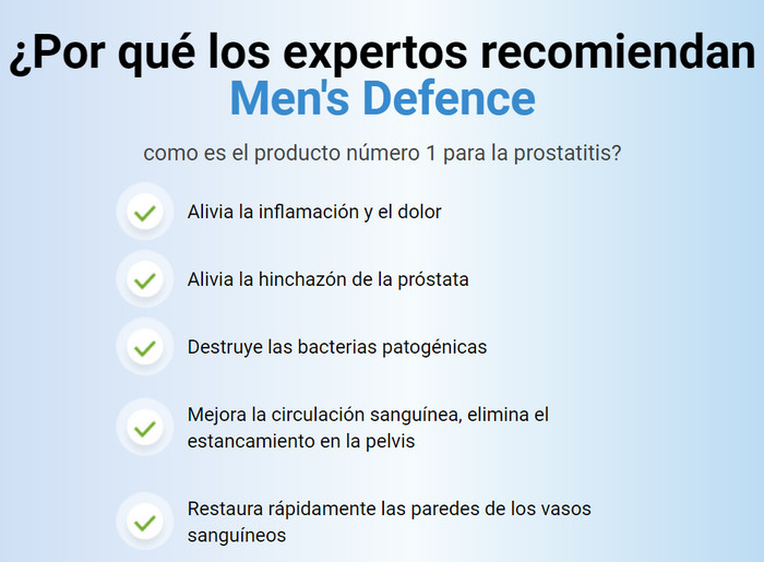 Para prevenir la aparición de complicaciones, el tratamiento de la prostatitis debe abordarse desde los primeros días de su manifestación. Para estos fines, el complejo Men’s Defence es muy adecuado, revisiones reales sobre las cuales informan que ayuda con las formas agudas y crónicas de la enfermedad.