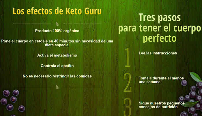 El medicamento Keto Guru, desarrollado sobre la base de extractos de componentes medicinales, que garantiza la seguridad de la salud. El quemador de grasa natural no tiene análogos y realiza varias funciones: elimina el exceso de peso, mejora la función del sistema hormonal y la glándula tiroides y previene la obesidad.
