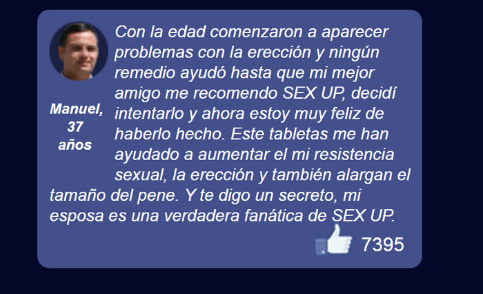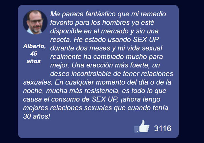 Una vida sexual vibrante y rica ayuda a los hombres a mantenerse en buena forma, a estar en la cima de un buen bienestar físico y psicológico. Si hay problemas con esto, Sex UP para la potencia es lo que necesita. Los comentarios, comentarios y opiniones sobre el producto Sex UP son positivos en los foros, de médicos y usuarios, porque los resultados positivos llegan rápidamente y duran mucho tiempo.