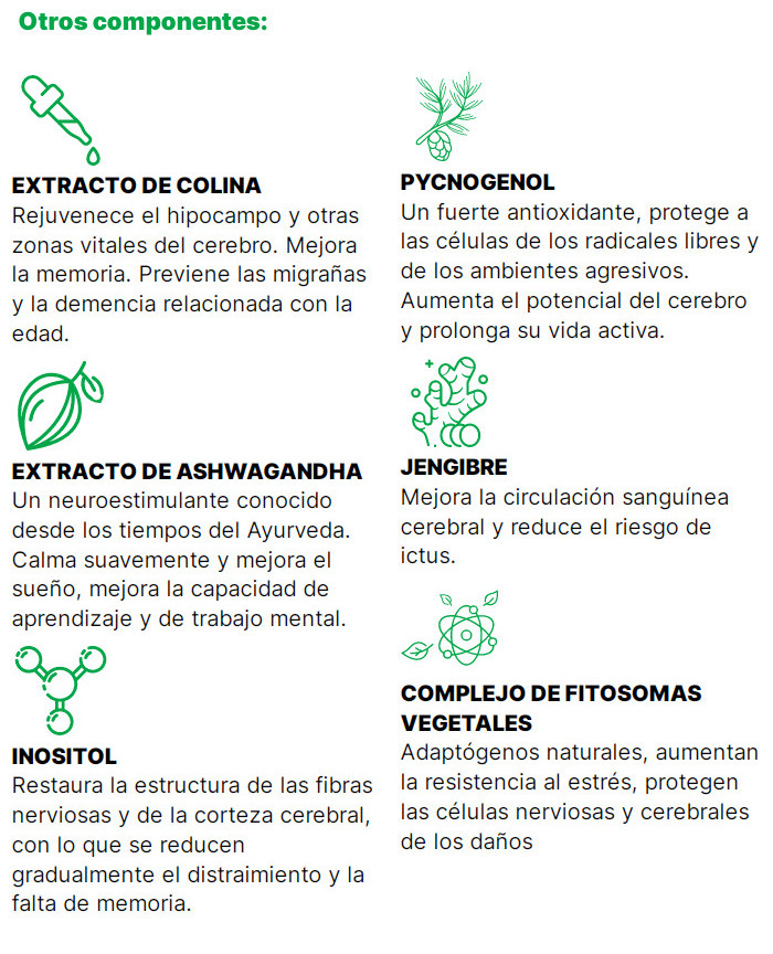 El efecto complejo de las cápsulas Memory Plus para mejorar la memoria proporciona una notable optimización de todos los indicadores mentales. En cualquier momento del día, tanto por la mañana como a última hora de la tarde, el cerebro funcionará sin problemas y procesará los problemas actuales a una buena velocidad. Todas las áreas de la vida se beneficiarán de esto, y obtendrá tiempo libre adicional, porque ahora podrá hacer frente a los negocios más rápido.