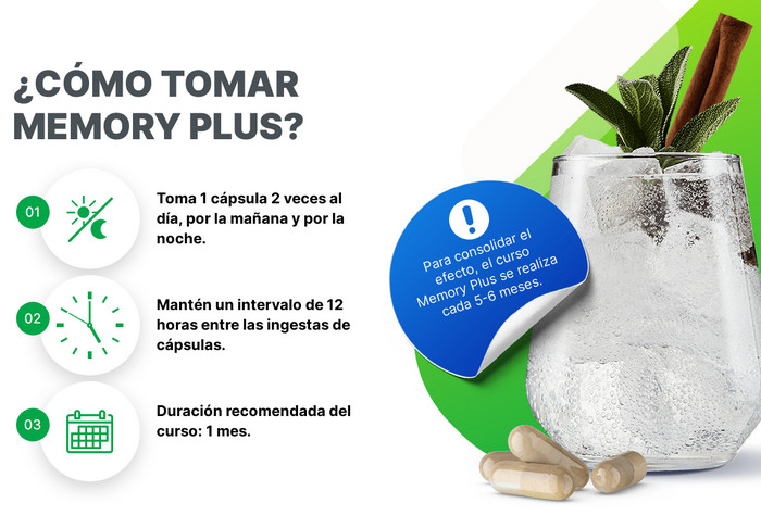Las instrucciones para el suplemento Memory Plus describen en detalle el procedimiento para tomar el remedio. Recomendaciones básicas para tomar el suplemento: