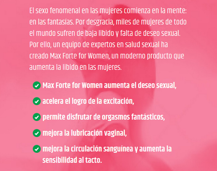Una herramienta eficaz para estimular la libido es la Max Forte for Women. La herramienta tiene un efecto estimulante pronunciado, por lo que aumenta la sensibilidad sexual y el deseo sexual.