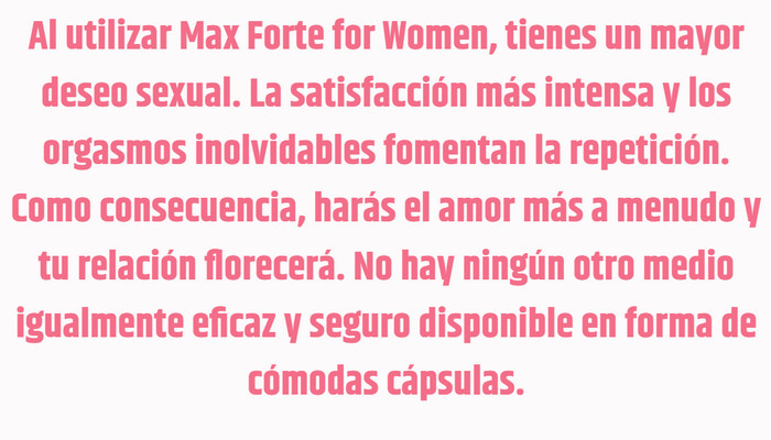 La complejidad, la falsa vergüenza y la timidez a menudo impiden que las mujeres se sumerjan en su vida sexual. También existen obstáculos naturales, por ejemplo, la menopausia o alteraciones hormonales de cualquier origen. Con Max Forte for Women las relaciones íntimas serán más ricas y diversas. Esta herramienta eliminará todas las barreras para el sexo de calidad y los orgasmos múltiples. Tu pareja está esperando una auténtica explosión de emociones, que se repetirá una y otra vez. ¡La indecisión, la frialdad y la moderación permanecerán en el pasado, y la pasión ocupará su lugar!