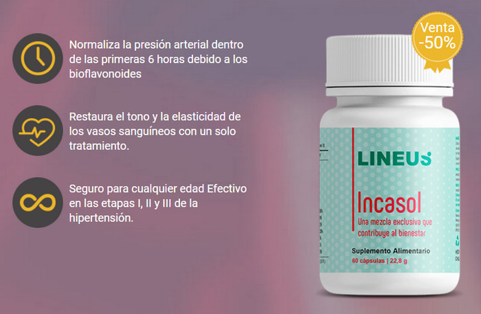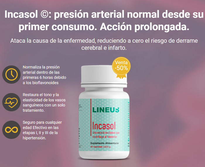 Incasol son cápsulas para la hipertensión. Este producto está diseñado para restaurar completamente todo el sistema cardiovascular. Es gracias a la mejora de la circulación sanguínea y al aumento de la elasticidad de los vasos sanguíneos que puede olvidarse de una vez por todas del dolor y la presión arterial alta.