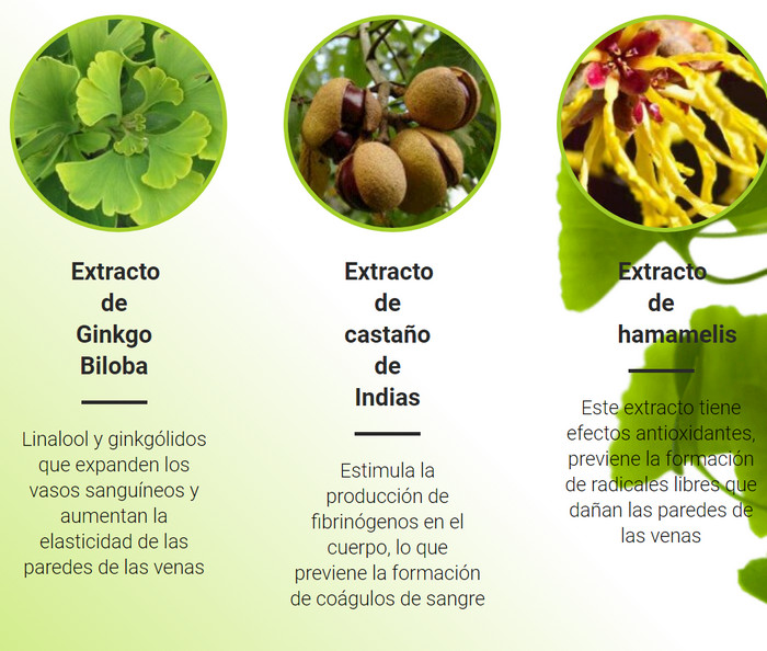- Mejora el tono vascular, previene la deformación, la expansión de las venas.