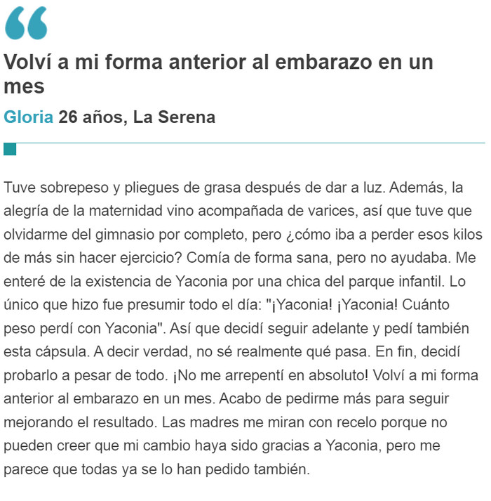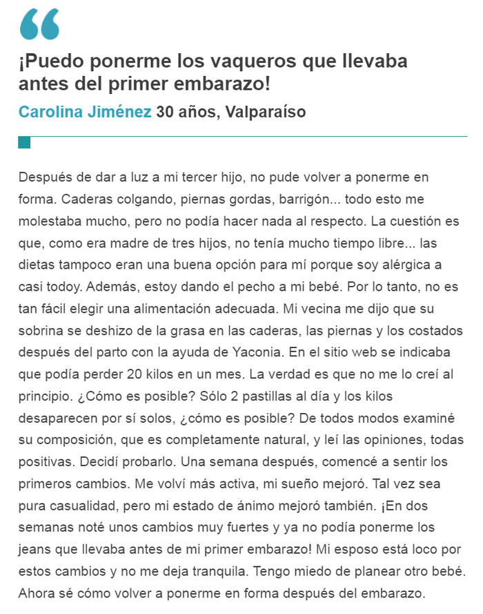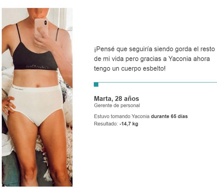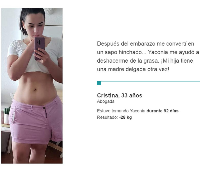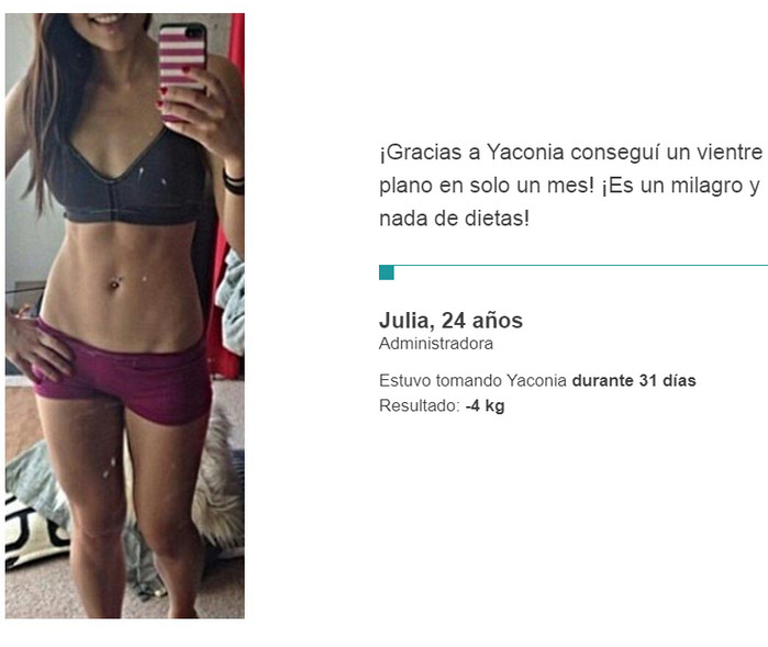 Yaconia es un suplemento único. Si lo toma regularmente, no tiene que torturarse con entrenamientos en el gimnasio o hacer una dura huelga de hambre: el deseo de comer alimentos dañinos desaparecerá por sí solo. Gracias a las cápsulas en un solo curso, encontrarás la silueta deseada y podrás mantener fácilmente una nueva forma. La retroalimentación positiva de los médicos es otro hecho indiscutible que habla a favor de este nuevo producto. Si ha estado buscando una forma segura de perder peso durante mucho tiempo, puede asumir que la ha encontrado.