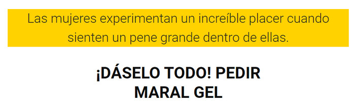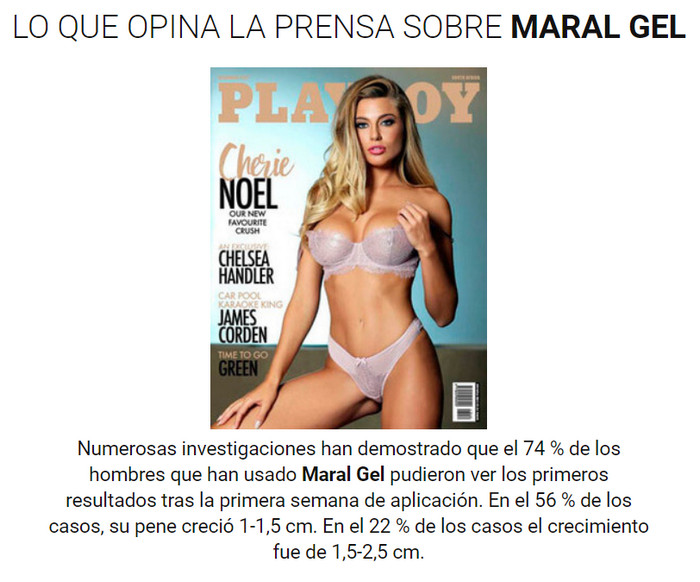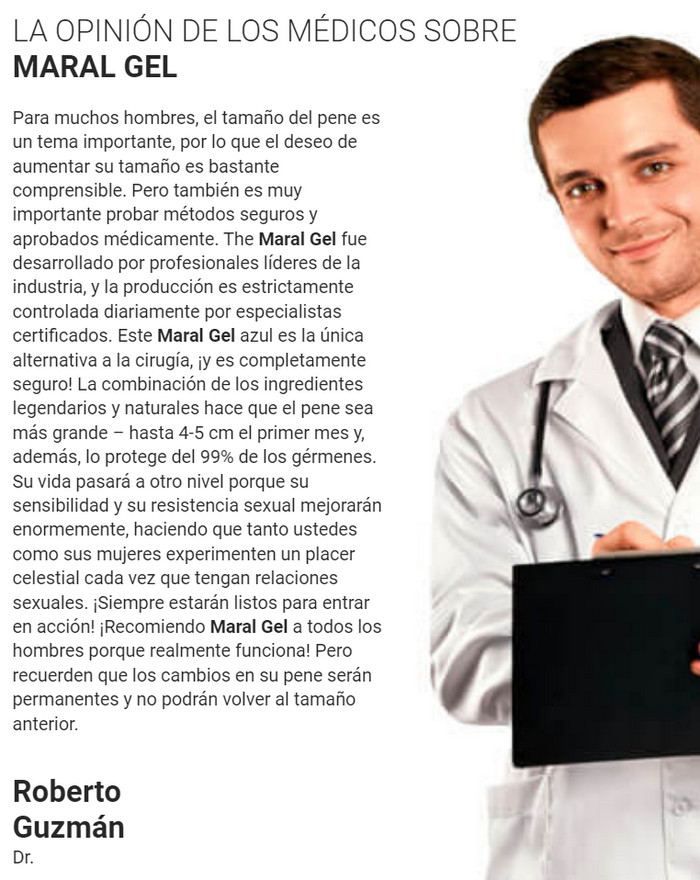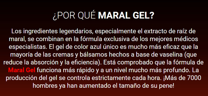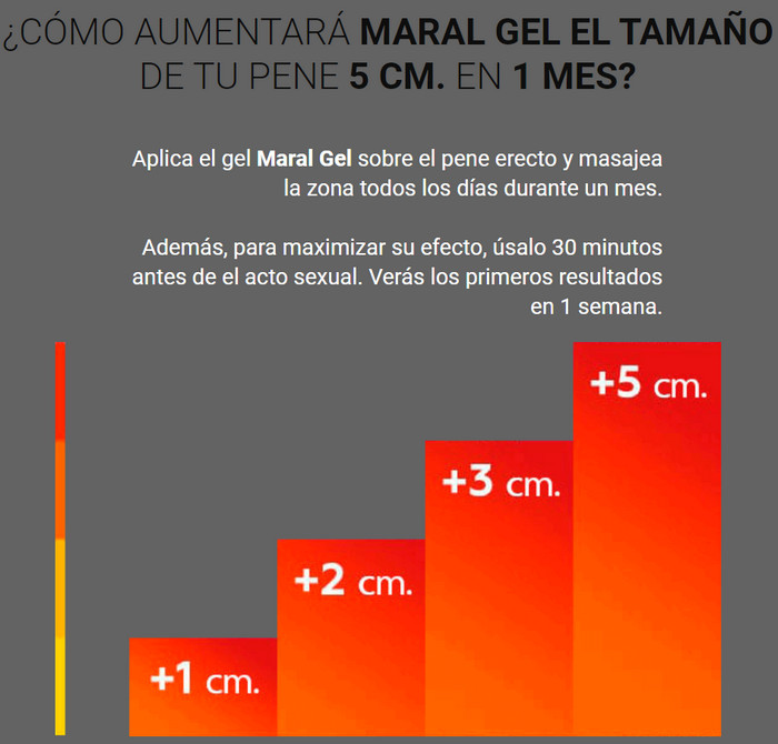 Maral Gel es un producto de gel a base de hierbas destinado a la aplicación externa antes de las relaciones sexuales. Gradualmente, en el proceso de pasar el curso de uso, el pene masculino aumenta de tamaño en varios centímetros, y su volumen también aumenta en paralelo.
