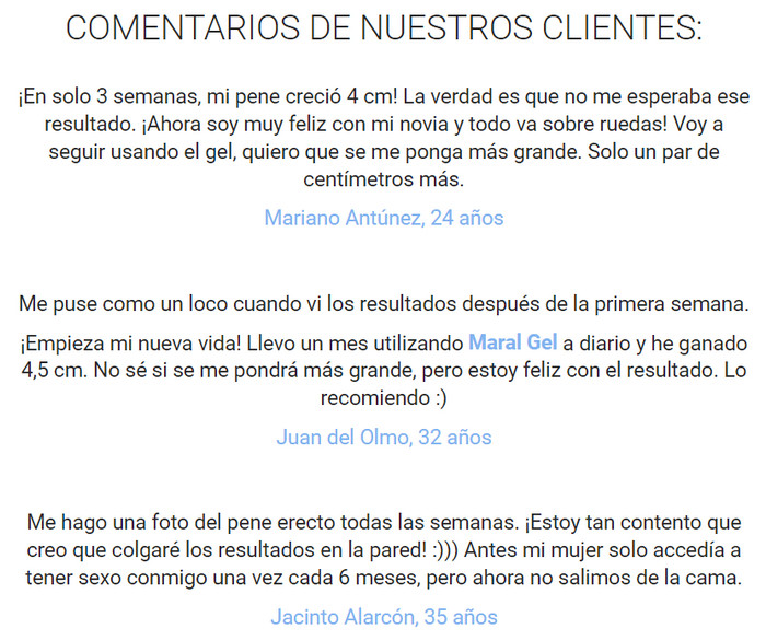 Es importante que todos los miembros del sexo fuerte se sientan ganadores en cualquier situación, y especialmente cuando se trata de sexo. Según las observaciones de los expertos, una de las condiciones determinantes para la confianza en uno mismo, la propia potencia, así como una alta autoestima es el tamaño de la dignidad. Maral Gel ayudará a corregir esta importante parte del cuerpo masculino sin cirugía, sin el uso de una bomba de vacío y otros dispositivos. La herramienta no solo estimula el crecimiento del pene, sino que también fortalece la erección, aumenta la resistencia y aumenta la duración de las relaciones sexuales.