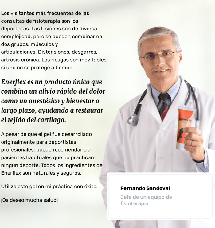Para detener la artritis o la osteocondrosis, debe adoptar una crema para las articulaciones Enerflex. Las capacidades del producto, que supera a los análogos que se ofrecen en las farmacias rusas, son extremadamente amplias. Va mucho más allá del alivio del dolor y restaura los tejidos dañados, brindándoles todo lo que necesitan para una regeneración acelerada. En menos de un mes, las funciones perturbadas volverán a la normalidad. Con este soporte, no serás abatido por lesiones, aumento del estrés y sensibilidad a las condiciones climáticas. El sistema musculoesquelético se fortalecerá y ya no sufrirá influencias negativas.