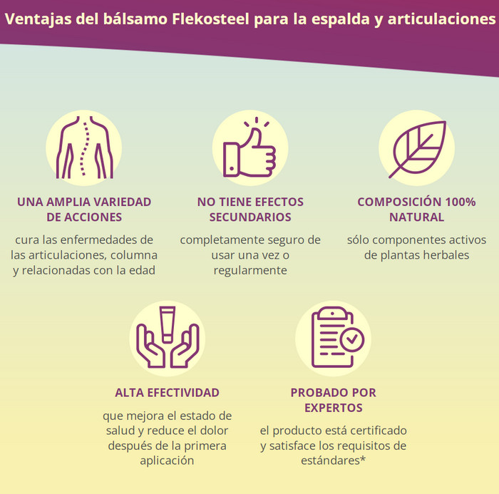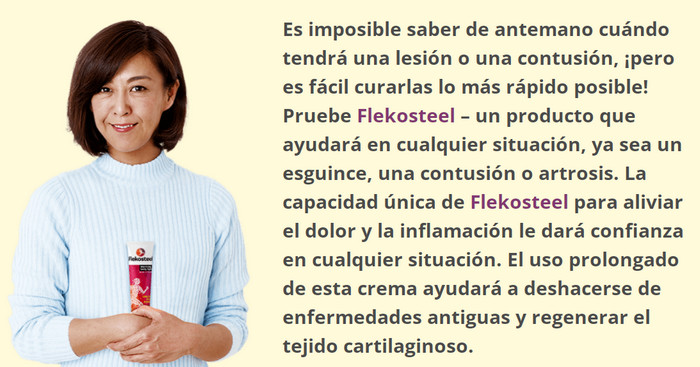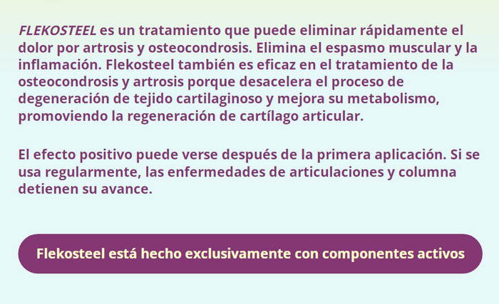 Si está cansado de soportar dolores en las articulaciones y quiere llevar una vida activa, compre Flekosteel. Tus articulaciones te lo agradecerán. Sin riesgos de uso.