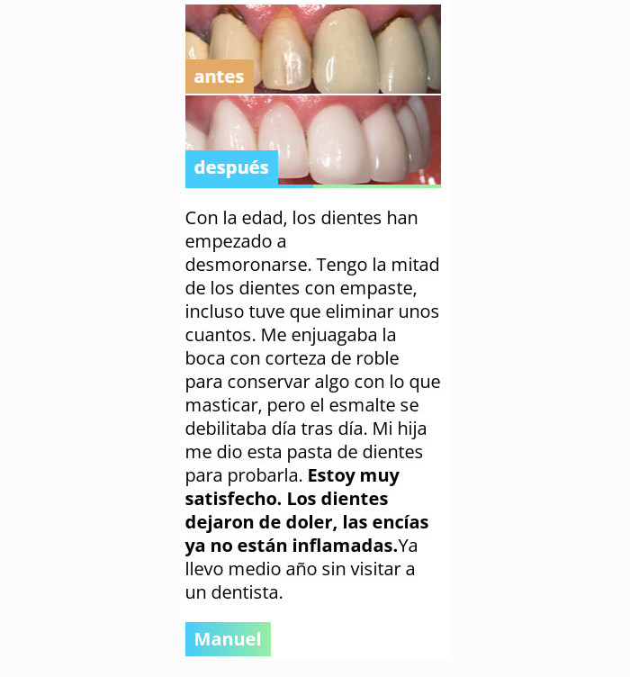Más de 7.000 personas han compartido su experiencia con el uso de pasta de dientes Denta Seal con efecto relleno, ¡y todas estas reseñas son positivas! Con solo comprar una vez una pasta remineralizante, las personas en solo un mes pudieron restaurar la blancura de sus dientes y al mismo tiempo deshacerse de la mayor sensibilidad del esmalte, las astillas y las microfisuras.