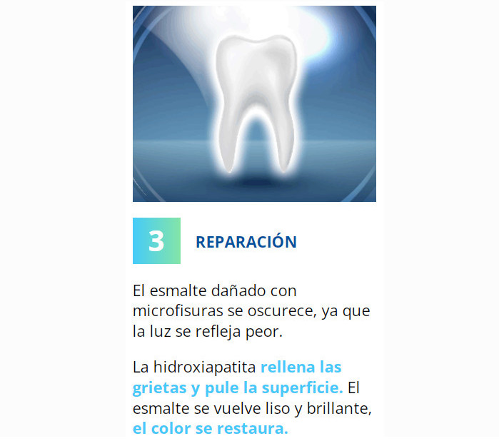 - Fortalece el esmalte dental frágil, elimina grietas, previene la caries dental