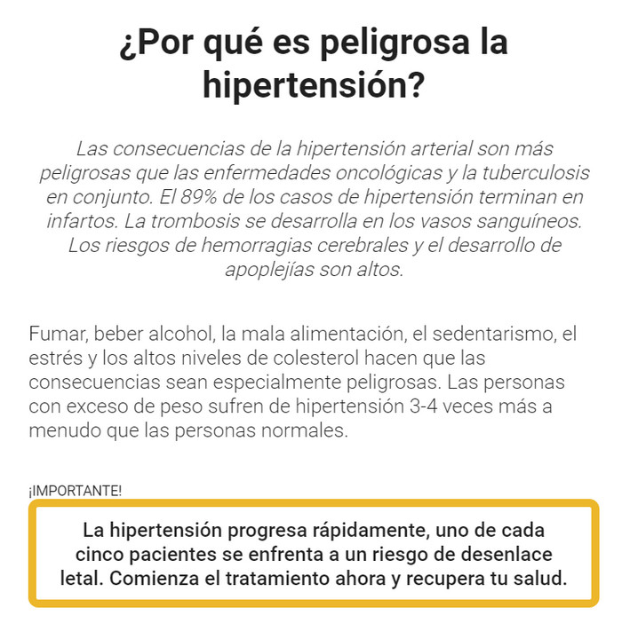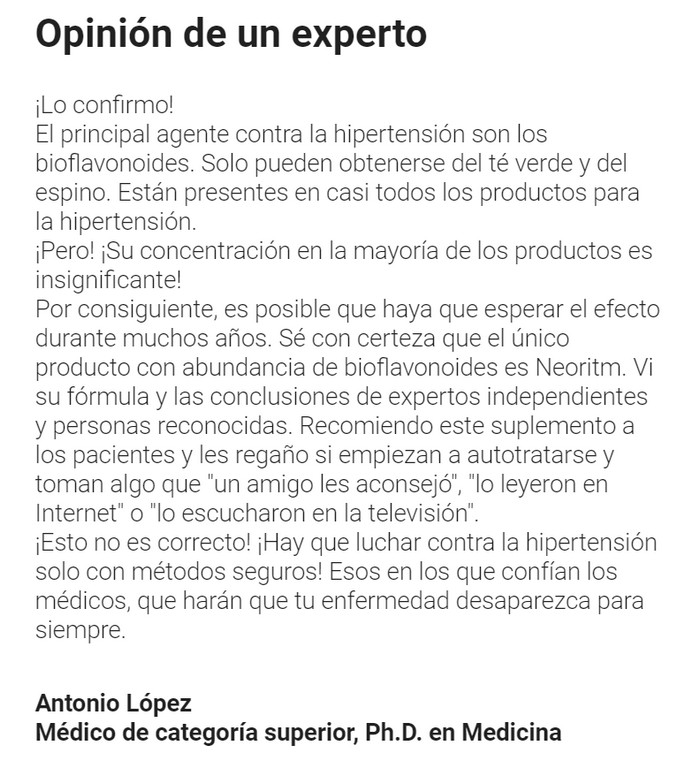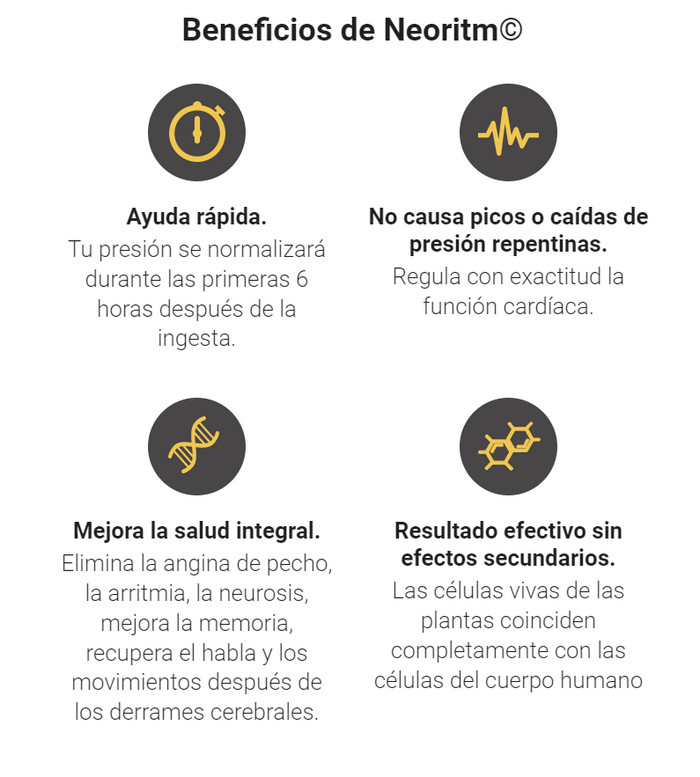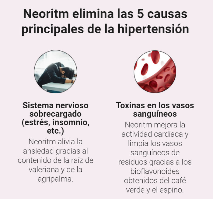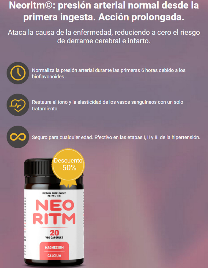 Las personas con hipertensión valoran cada día vivir sin sobresaltos y saltos repentinos en las lecturas de presión arterial. Al descubrir las cápsulas Neoritm, que son superiores a las tabletas de farmacia convencionales en términos de eficacia, consolidará su excelente salud durante mucho tiempo. La herramienta única no solo corrige la presión saltada, sino que fortalece las áreas vulnerables, cancelando el riesgo de accidentes cerebrovasculares y ataques cardíacos. El cerebro y los órganos recibirán suficientes nutrientes y oxígeno, la sangre comenzará a circular libremente por las arterias, por lo que las manifestaciones enfermizas desaparecerán.