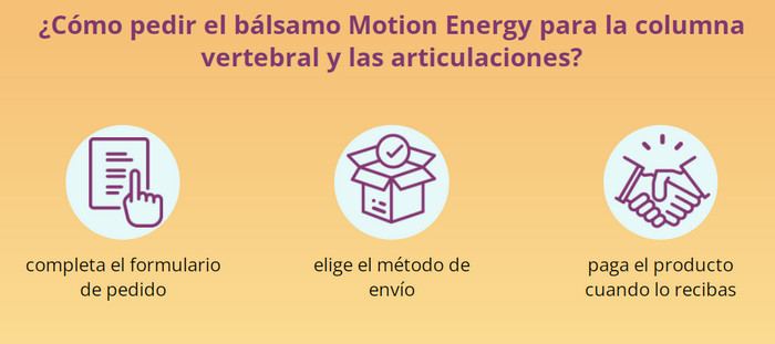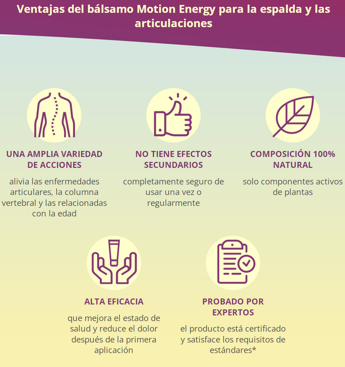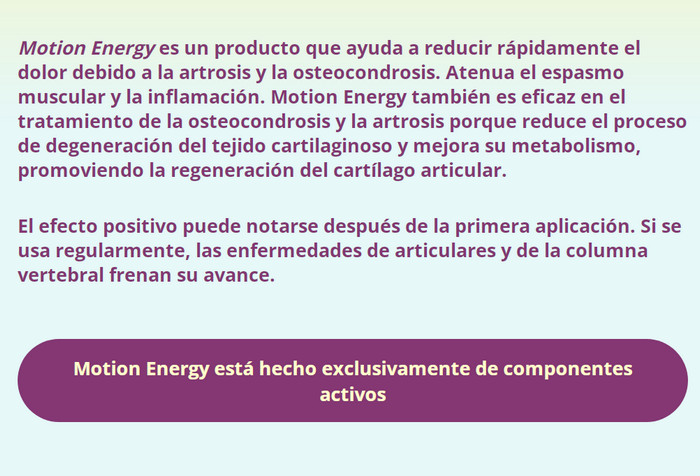 Motion Energy para las articulaciones es fundamentalmente diferente de las preparaciones farmacéuticas habituales. Primero, este gel no es adictivo. Y en segundo lugar, no solo enmascara el dolor, sino que también elimina su causa raíz, es decir, lucha directamente con la causa de la enfermedad. Para ello, los componentes activos del fármaco penetran a través de la piel directamente en la bolsa articular. Contribuyen a la optimización de la nutrición y regeneración celular de los tejidos dañados.