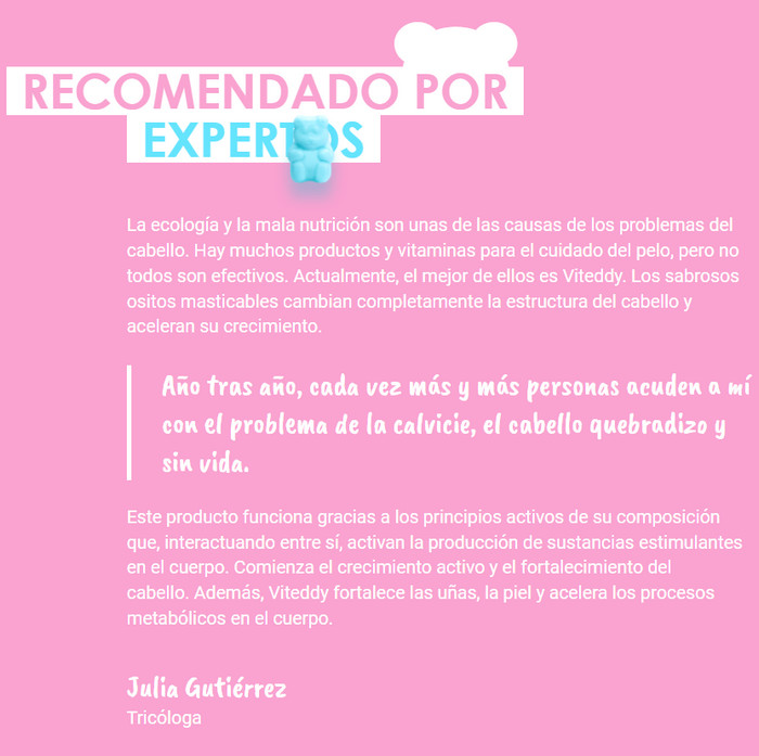 El cabello se forma a partir de folículos debajo de la piel, donde se llevan a cabo complejos procesos bioquímicos para mantener el cabello saludable. En particular, las vitaminas están involucradas en el metabolismo de los nutrientes en las células, por lo que si son deficientes, el cabello se vuelve quebradizo, opaco y se cae. En caso de calvicie, que puede ocurrir debido a fallas hormonales y otros problemas de salud, debe consultar a un médico. La respuesta a la pregunta de qué hacer si el cabello se cae mucho puede estar en el plano de la nutrición, por lo que debe revisar su dieta y agregarle algunas sustancias biológicamente activas si el especialista no ha identificado ninguna enfermedad. Viteddy es un suplemento útil para el cabello que estimula el crecimiento del cabello y le da belleza.