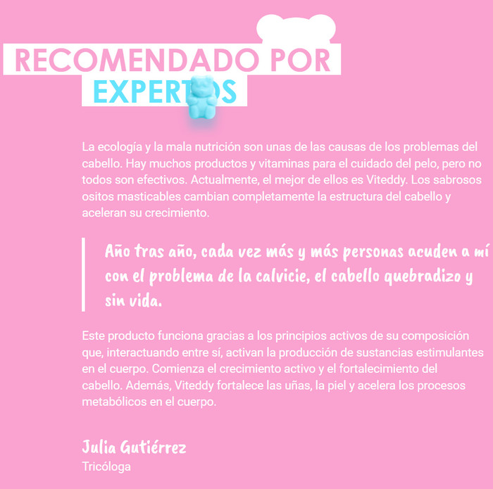 Si el cabello se cae debido a un desequilibrio hormonal, se observa alopecia androgenética y las uñas se han visto afectadas negativamente por una infección (por ejemplo, un hongo), entonces Viteddy no ayudará y debe consultar a un médico para una consulta completa , examen y tratamiento eficaz.