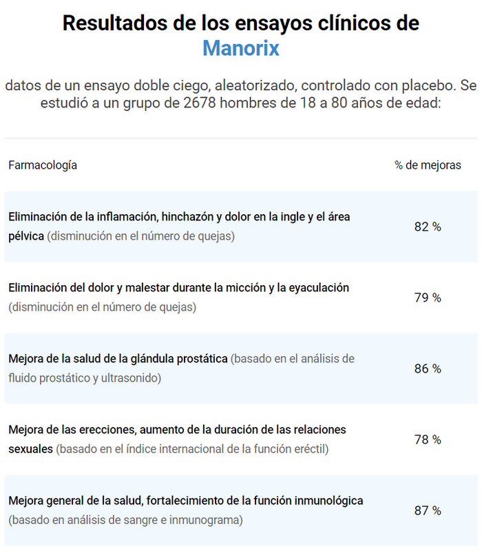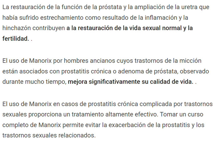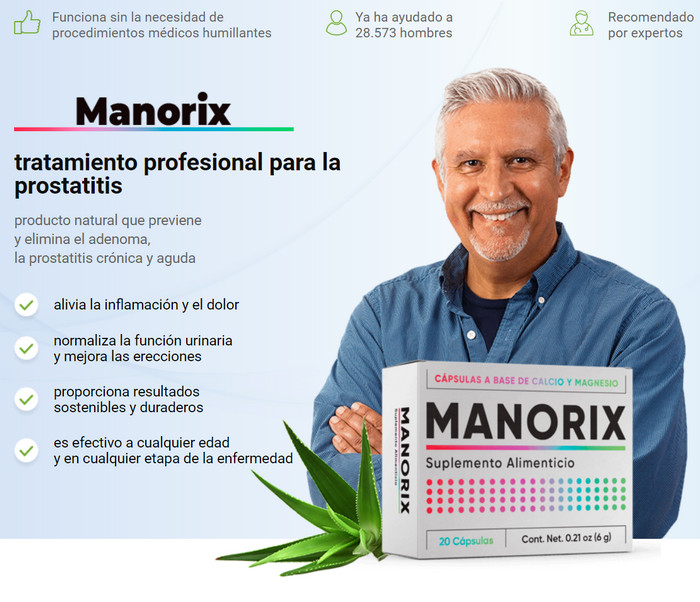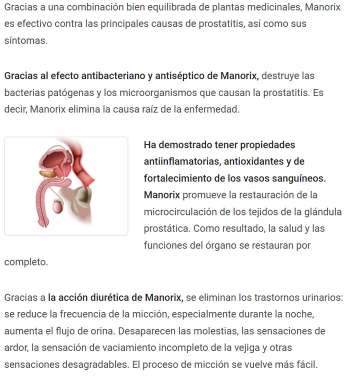 Manorix es un fármaco único de nueva generación, eficaz contra la prostatitis aguda y crónica. Alivia la inflamación, los calambres y el dolor. Mejora la micción y la micción. Paralelamente, fortalece el organismo para evitar recaídas. También tiene un efecto beneficioso sobre la potencia.