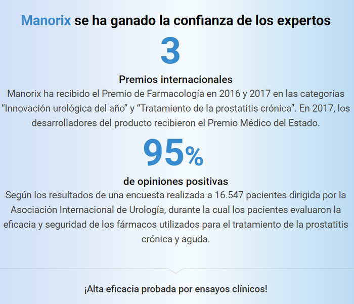 Los medios para el tratamiento de la prostatitis Manorix no tienen análogos en el mercado nacional y europeo. Tiene una fórmula única, composición 100% natural en la concentración óptima de ingredientes activos.