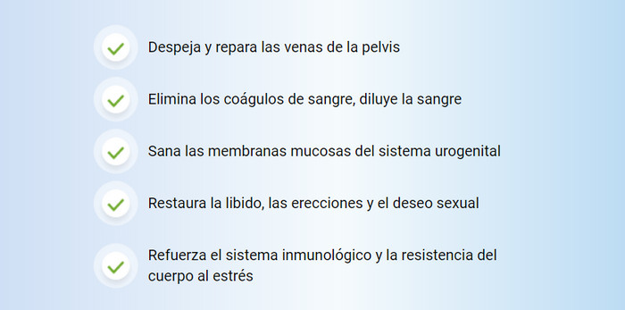 - Efecto beneficioso sobre el estado y funcionamiento de los órganos del sistema genitourinario masculino.
