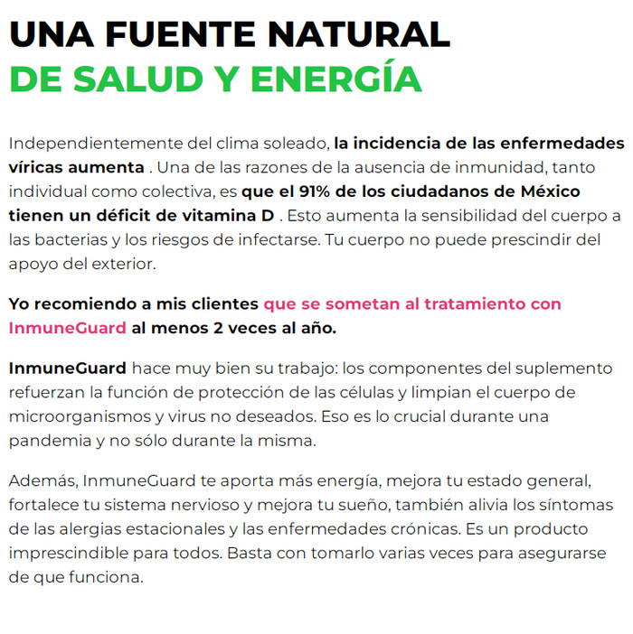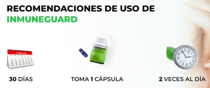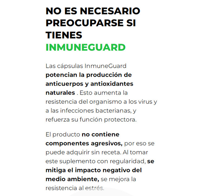 InmuneGuard – esta es una herramienta especial para fortalecer el sistema inmunológico. Satura el cuerpo con todas las vitaminas y minerales necesarios, le da la capacidad de combatir los virus. Además, este remedio se puede usar como remedio para los resfriados, porque es entonces cuando la inmunidad de nuestro cuerpo se debilita y necesita apoyo. ¡Ayuda a tu cuerpo a trabajar de la manera más eficiente posible!