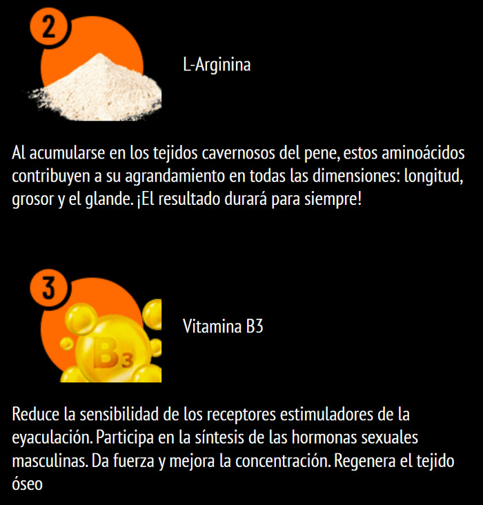 Patron están hechos de componentes completamente inofensivos. Esta herramienta está diseñada para restaurar simultáneamente la salud de los hombres y mejorar la erección. El extracto de hoja de Ginkgo biloba y el extracto de hierbabuena son buenos para estimular la circulación sanguínea, lo que afecta tanto a la erección como al tamaño del pene. Además, la composición incluye extracto de raíz de ginseng, que estimula bien las funciones sexuales. Tal conjunto de componentes naturales promueve la regeneración de la piel y la vuelve suave y agradable al tacto, nutre el cuerpo desde el interior y estimula la saturación de los cuerpos cavernosos con oxígeno y nutrientes.