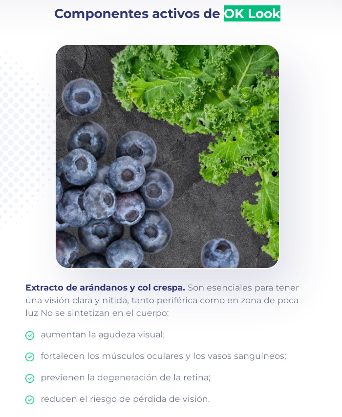 La preparación OK Look para la visión se caracteriza por una composición única y exclusivamente natural que combina los siguientes valiosos ingredientes y componentes naturales: