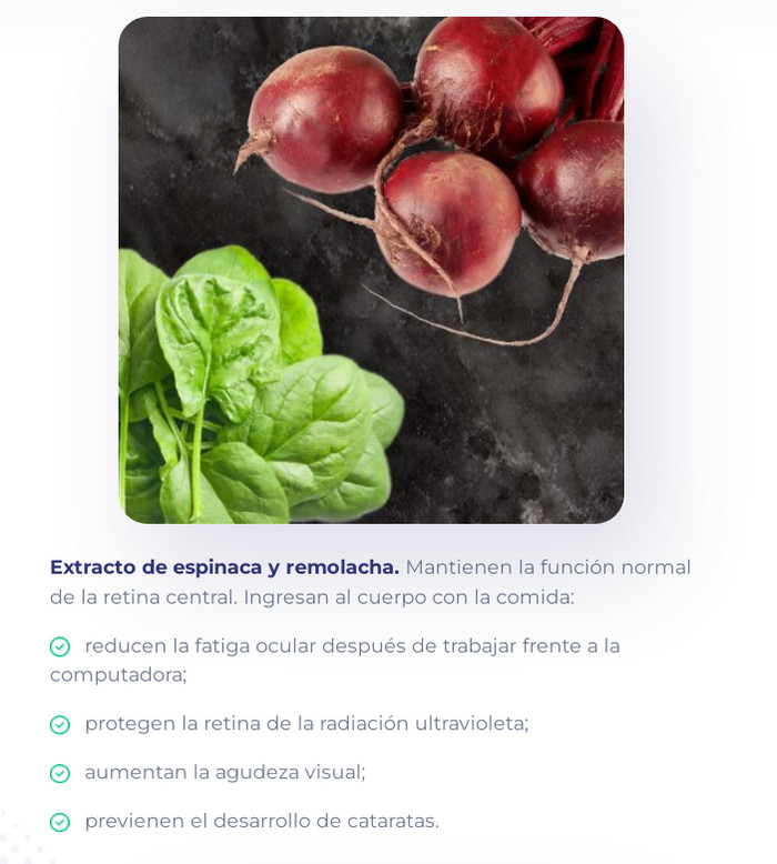 - Brinda protección confiable a la retina contra la destrucción, la degeneración y los efectos negativos de factores externos. Previene el desarrollo de enfermedades oftálmicas.