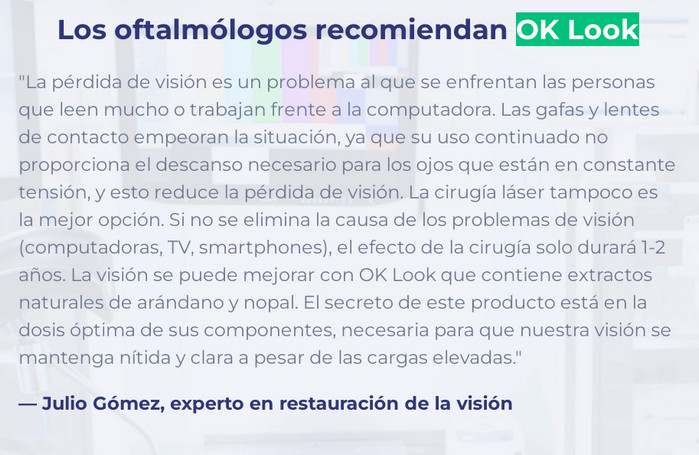 Afortunadamente, hoy en día existe un remedio que puede restaurar la capacidad perdida de ver bien. OK Look – las cápsulas para restaurar la visión le permiten restaurar rápidamente la claridad de la percepción visual. Después de un tratamiento completo, una persona podrá olvidarse de lentes y anteojos, evitando la necesidad de una intervención quirúrgica.
