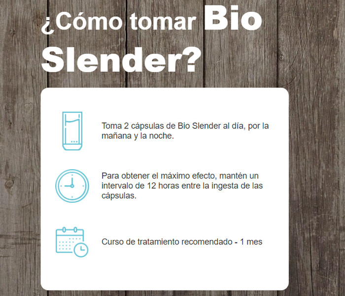 Durante la terapia con cápsulas Bio Slender se optimiza el proceso de digestión. Gracias a la droga, se desarrolla la actitud correcta hacia los alimentos, se restauran los ciclos biológicos del cuerpo. El medicamento tiene un efecto rápido y no causa reacciones adversas. En un curso de tratamiento, puede restablecer el equilibrio de carbohidratos y grasas sin consecuencias para la salud.