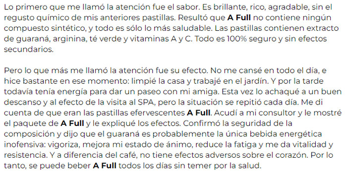 ¿Por qué se necesitan producto A Full? Pocas personas saben que hoy en día las frutas y verduras naturales que se compran en las tiendas no tienen la cantidad adecuada de vitaminas y minerales. Así, consumiéndolas en la comida, no conseguimos el efecto deseado. Muchos expertos han confirmado este hecho más de una vez, y hasta el día de hoy recomiendan beber vitaminas complejas adicionales para la memoria y el cerebro. A Full no tiene efectos secundarios y contraindicaciones debido a los ingredientes naturales en la composición.