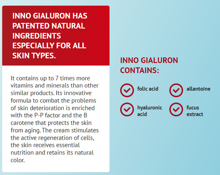 Inno Gialuron is an effective anti-wrinkle cream that will nourish your skin with vitamins and give you a feeling of youth, freshness and velvety to your skin without much effort and large expenses.