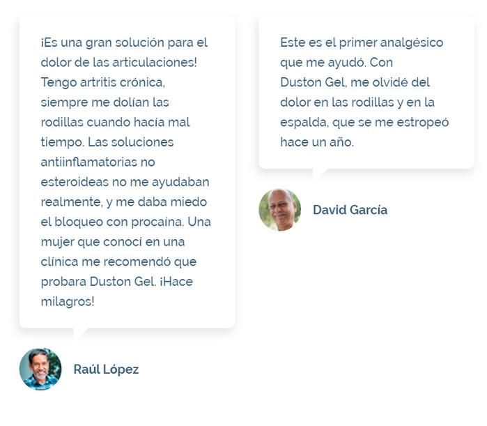 El desarrollo de Duston Gel. Contiene elementos especiales que contribuyen al buen funcionamiento de las células del cartílago ya la regeneración de la articulación en su conjunto. ¡Dentro de un par de días después de tomar, la composición afectada se sentirá mejor y el dolor desaparecerá! Dado que Duston Gel no solo restaura, sino que también anestesia.