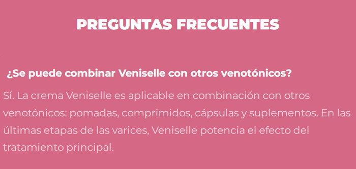 Costo demasiado bajo, monto fijo y tiempo de entrega, muchas bonificaciones adicionales a menudo indican fraude. Veniselle hoy en día tiene una gran demanda, y los estafadores no han dejado este hecho sin atención. Se dedican a la producción de crema falsa para las venas varicosas, haciéndola pasar por real. Se utilizan recursos dudosos para vender productos de baja calidad. Para minimizar el riesgos de cooperación con los estafadores, ¡debe realizar un pedido en un pagina oficial!