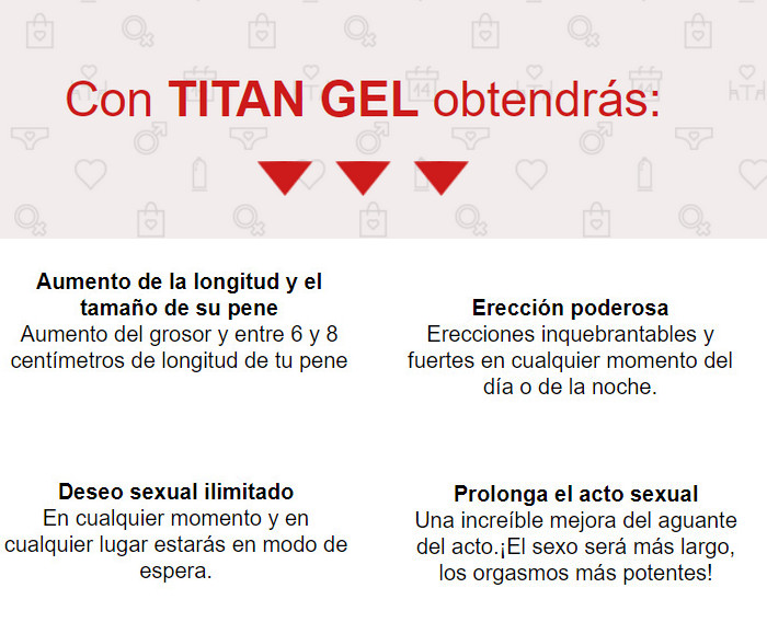 - Acción compleja. Titan Gel aumenta el tamaño del pene en 6 cm, aumenta la potencia, fortalece la erección, tiene un efecto bactericida, antiinflamatorio y estimulante, y también aumenta la libido y realiza una función lubricante. Gracias a una acción tan completa, es imprescindible para toda pareja que quiera sacar el máximo partido al sexo.
