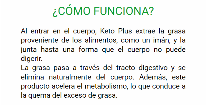El último complejo de pérdida de peso Keto Plus es un producto desarrollado por científicos de varios países. Los especialistas incorporaron muchas tecnologías innovadoras al proceso de fabricación, combinaron de manera competente varias recetas y crearon una fórmula completamente nueva a partir de ella, crearon las últimas tecnologías para cosechar y procesar materias primas orgánicas. El resultado es un producto que combina la última tecnología y la herencia milenaria de la medicina tradicional y la cosmetología. Keto Plus está disponible en forma de cápsulas a base de ingredientes naturales. Keto Plus tiene muchas beneficios sobre los análogos y funciona de la siguiente manera:
