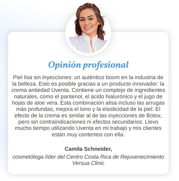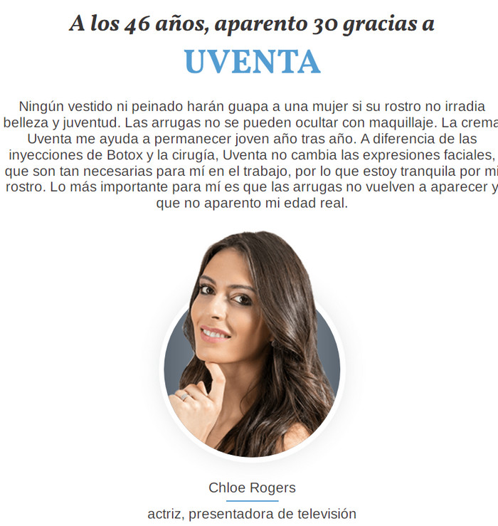Uventa contiene nutrientes que enriquecen la piel para mantener su juventud, frescura y salud. Gracias a estos beneficios, muchas mujeres exitosas y famosas actúan como embajadoras de esta crema. Ligero y suave Uventa asegurará la restauración de la epidermis por la noche.