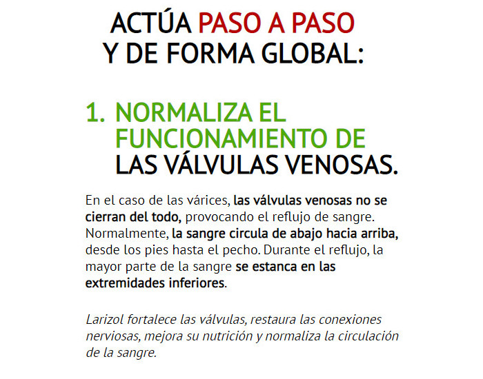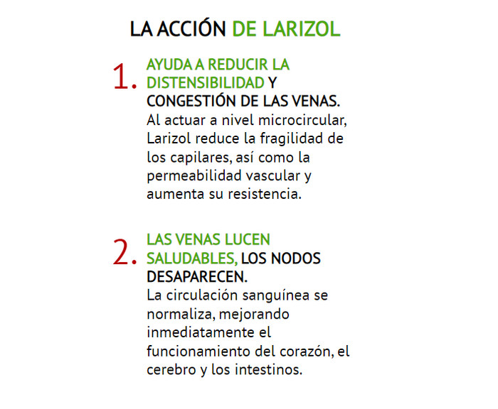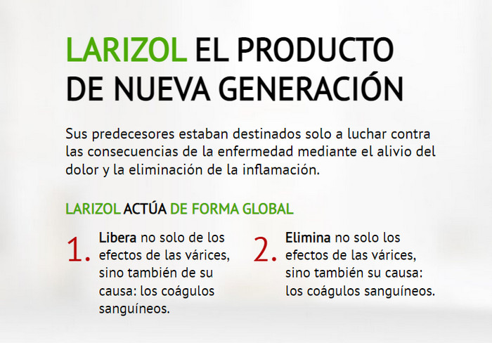 Larizol es la única alternativa para eliminar las varices sin cirugía, este producto no tiene análogos en el mercado. En el artículo puede leer sobre qué es Larizol, para que sirve, cómo funciona el producto, cómo usarlo de acuerdo con las instrucciones de uso, cuales son los ventajas, donde comprar Larizol, donde lo venden y cuál es su precio en Honduras. En los foros y pagina oficial, lea testimonios, comentarios y opiniones sobre Larizol.