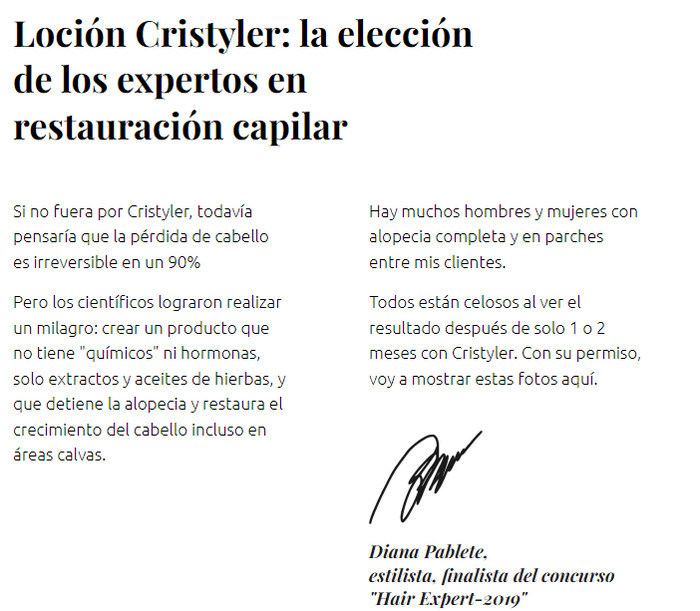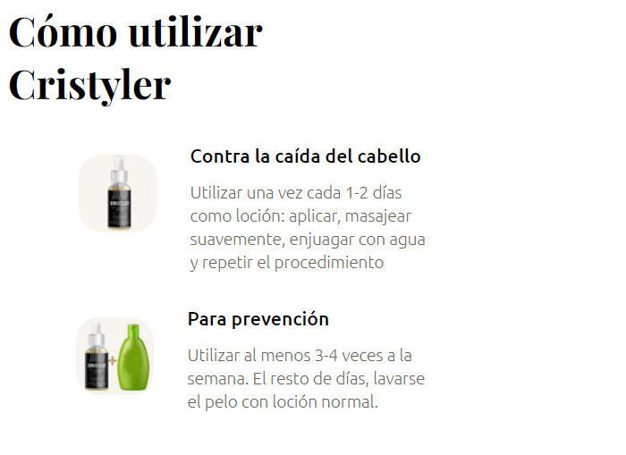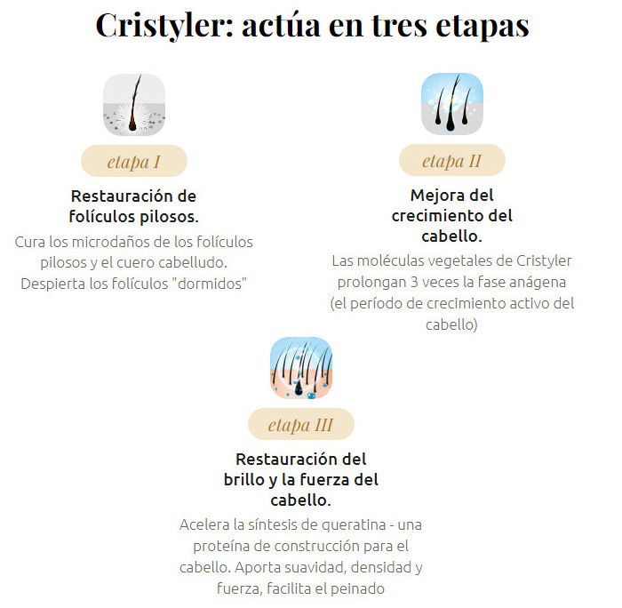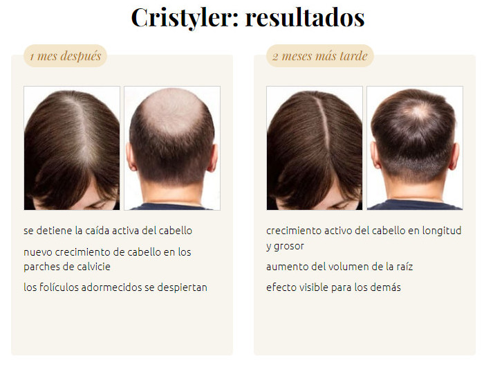 Después de 2-3 meses de aplicación regular Cristyler, el cabello se ve más joven, brillante y voluminoso, y el efecto persiste incluso después de suspender el producto. Es imposible encontrar productos de eficacia similar a Cristyler en las farmacias.