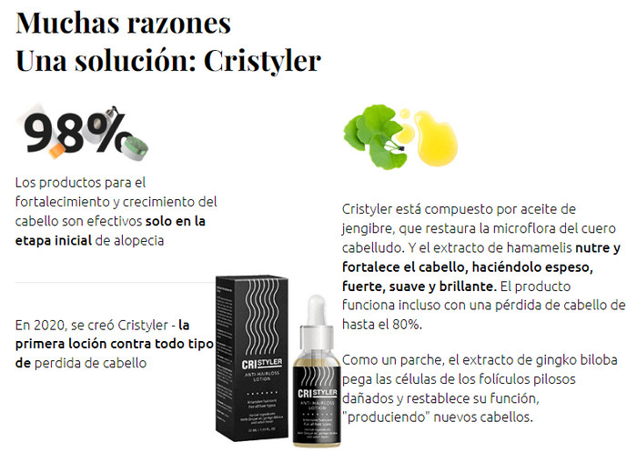¿Qué problemas puede Cristyler ayudar a resolver? A esta pregunta, los cosmetólogos y tricólogos que desarrollaron la fórmula del producto enumeran al menos 50 condiciones que conducen a la pérdida y adelgazamiento del cabello, puntas abiertas, opacidad o canas y descamación de la piel. Tarde o temprano, las mujeres notan que su cabello elegante se ha adelgazado, ha perdido volumen y no se ve tan atractivo como antes. Sin efectos secundarios y contraindicaciones.