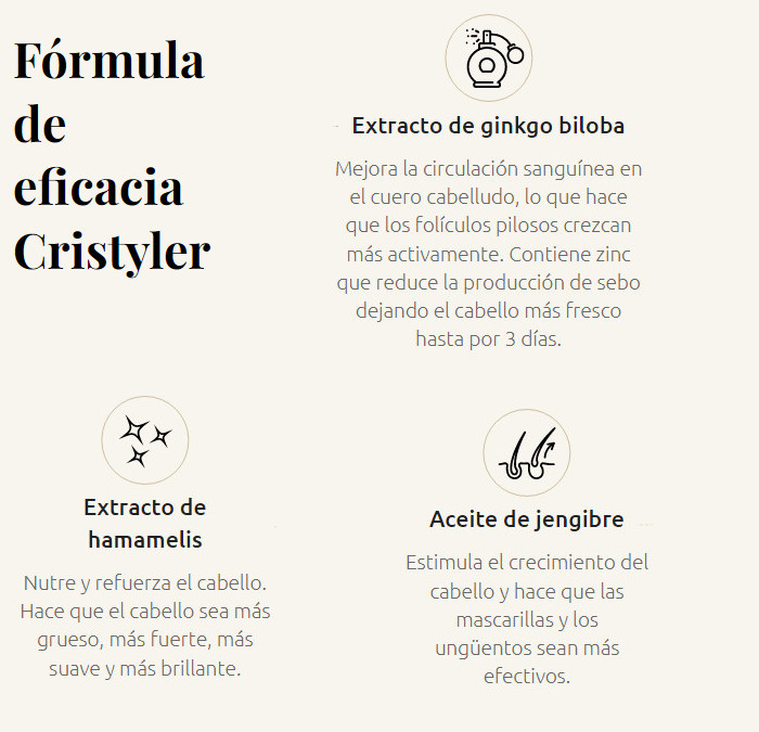 La composición Cristyler incluye ingredientes naturales que tienen un efecto beneficioso tanto en el cabello como en la piel, a saber: