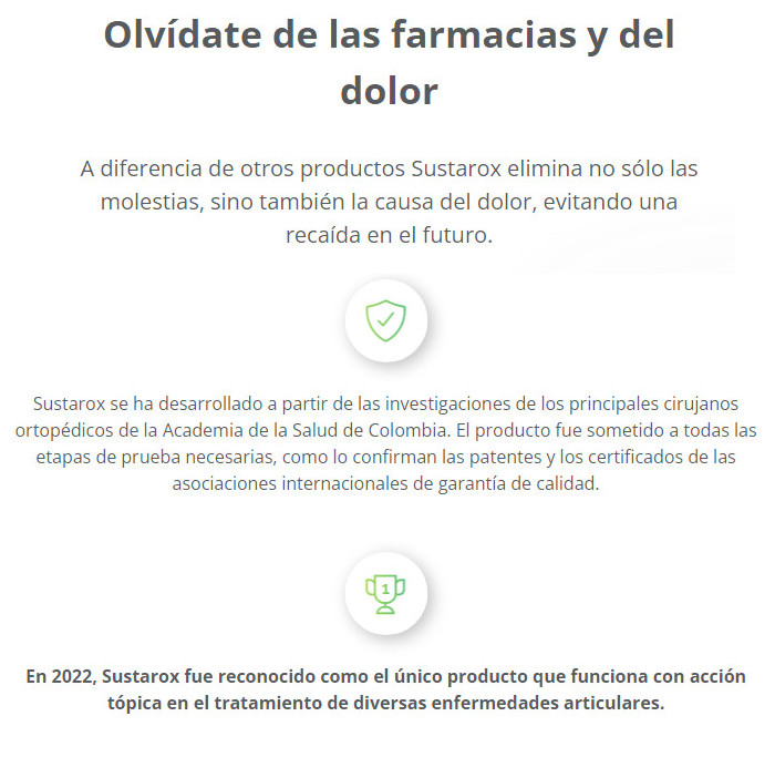 El siguiente artículo le ayudará a responder preguntas como qué es Sustarox, para qué sirve, cuáles son sus beneficios sobre los análogos que no funcionan, donde la venden, donde comprar y cual es su precio de Sustarox en Colombia. También en los foros puedes leer testimonios, comentarios y opiniones reales sobre Sustarox.