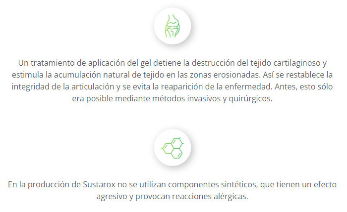 El preparado Sustarox es una crema-gel destinada al tratamiento de las articulaciones. Demostró ser más efectivo en el tratamiento de lesiones y esguinces recibidos durante la práctica deportiva: con bursitis, artrosis, espolones en el talón, artritis, osteocondrosis y otras enfermedades del sistema musculoesquelético.