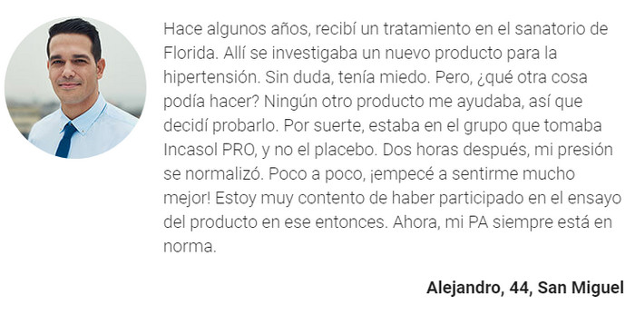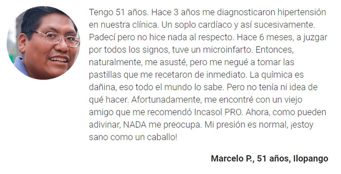 El resultado del uso de tales medicamentos es una disminución a corto plazo de la presión arterial sin la esperanza de una vida plena sin la necesidad de tragar un puñado de tabletas y cápsulas 2 veces al día. Con la droga Incasol PRO todo sucede de otra manera. No reduce la presión, pero activa sus mecanismos de control, no bloquea el dolor y otros síntomas desagradables, sino que restaura el funcionamiento de todos los sistemas del cuerpo para protegerlos contra daños.