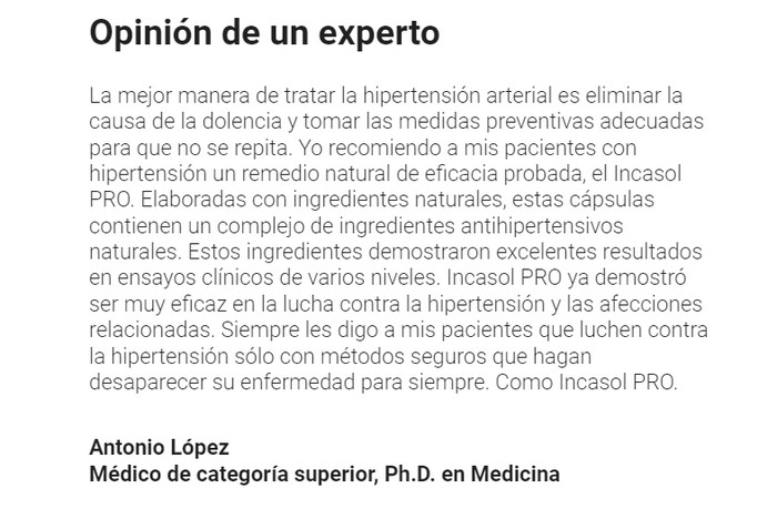 No debe esperar que la presión vuelva a la normalidad por sí sola, porque su aumento está dictado por ciertas razones. Es por eso que debe comenzar a tomar de inmediato Incasol PRO – cápsulas para la hipertensión, que no solo reducen la presión, sino que también combaten las razones de su aumento.