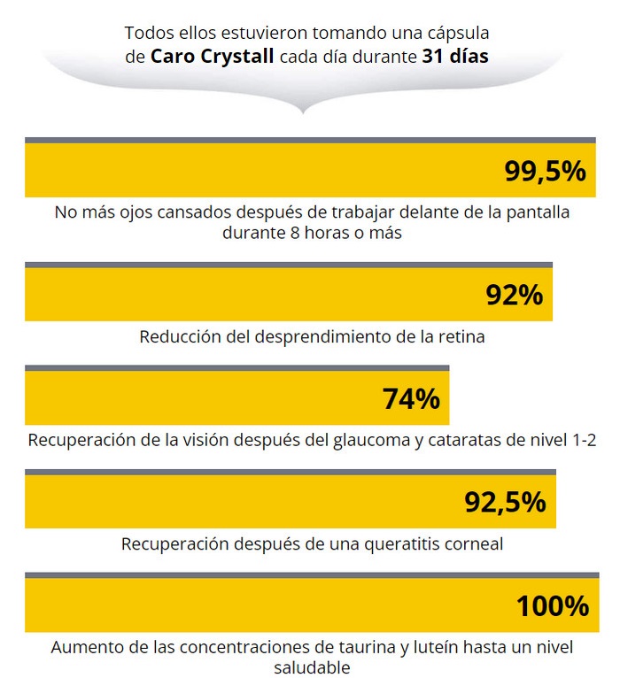 A diferencia de otros medicamentos que solo alivian los síntomas, Caro Crystall realmente cura. Elimina directamente las causas de la pérdida de visión. Partiendo desde la eliminación de molestias hasta la restauración de la retina a nivel celular. Las cápsulas rejuvenecen las células, normalizan la presión intraocular y la circulación sanguínea.