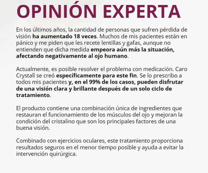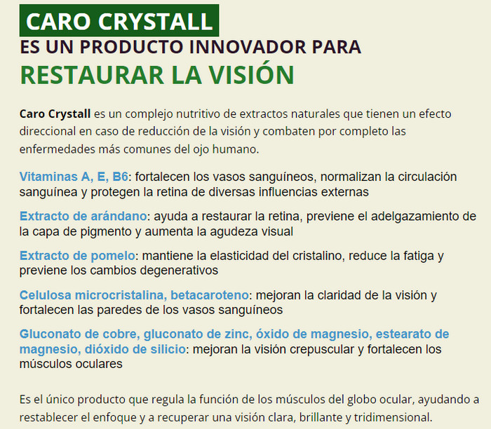 Caro Crystall – son cápsulas naturales para mejorar la visión, que son capaces de restaurar completamente la salud de los órganos visuales en el menor tiempo posible. Analicemos qué es Caro Crystall, cómo funciona el producto, para qué sirve, cómo usarlo de acuerdo con las instrucciones de uso, cuáles son las beneficios Caro Crystall, donde comprar cápsulas, donde lo venden en Nicaragua y cuál es su precio, y también analizar testimonios, comentarios y opiniones sobre Caro Crystall en los foros y pagina oficial.